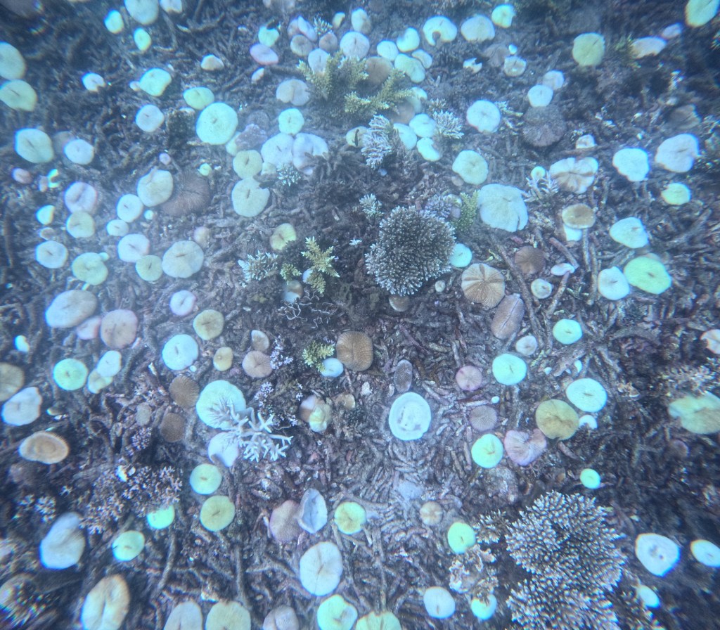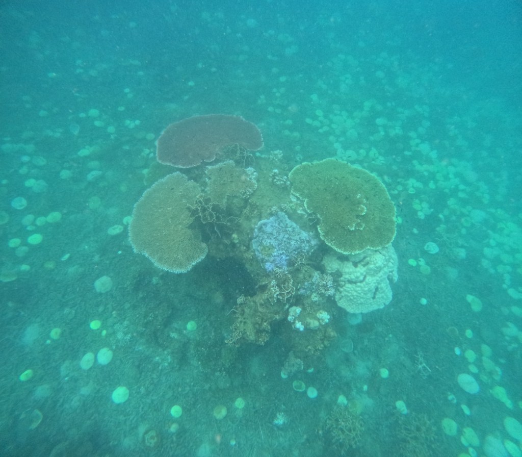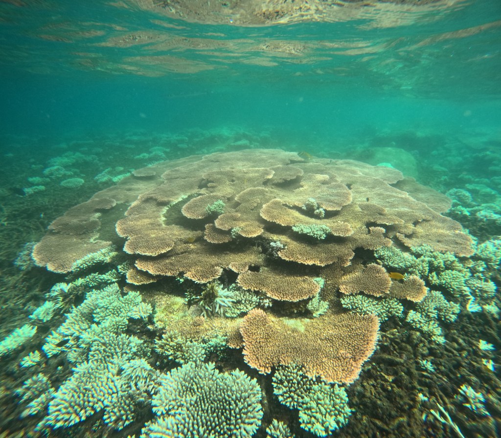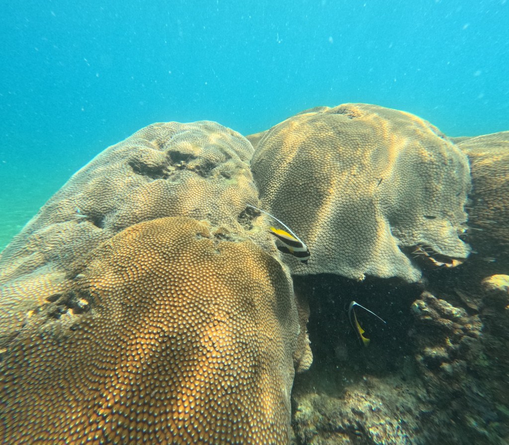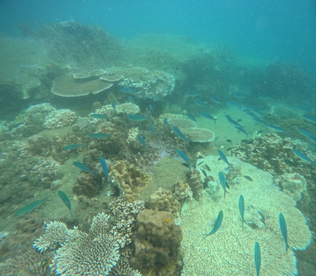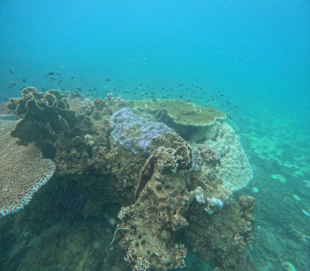 Rock formations create castle like archetypes and thriving fish communities. Green corals take the shape of thousands of lillies, proudly thriving next to sponge like orange corals; yellow coral, as perfect as the one you see in photos, shoot upwards with open mouths calling to anything that might feed it; diving below, you are surrounded by the flowing forms of purple funghi like pads and blue oyster like shapes nested in between, breathing lightly as the silent world of fish moves around it. The colours are not what are most impressive though, because the colours are not always the brightest or the most diverse, in fact, colourful corals are not always considered healthy, and therefore the ones you will see most will be more muted tones of then colours mentioned above, and likely different variations of browns. This only makes it all the more beautiful, with a greater diversity of striking fish, creating contrasts or completely blending into their surrounding environment.